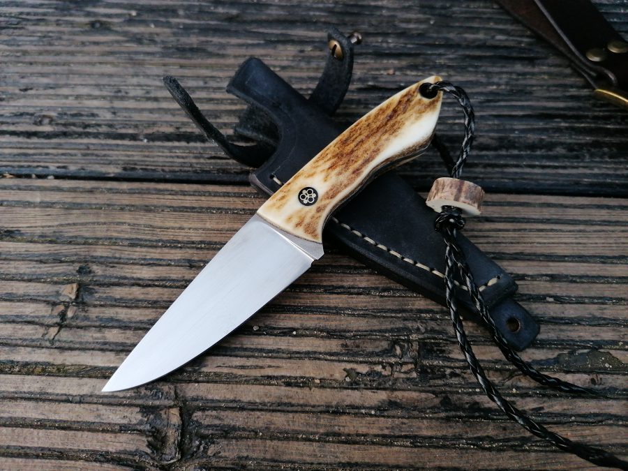 Rękojeść: 1) mosiądz przekładki fibra i mosiądz, drewno stabilizowane, poroże jelenia, fibra mosiądz i pin mozaikowy – jeleń św. Huberta. Pochewka skóra farbowana. 2) G10, poroże jelenia, pin węglowy – fluo, przelotka węglowa. Pochewka skóra farbowana na szyję.