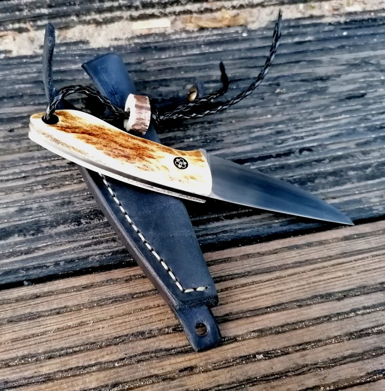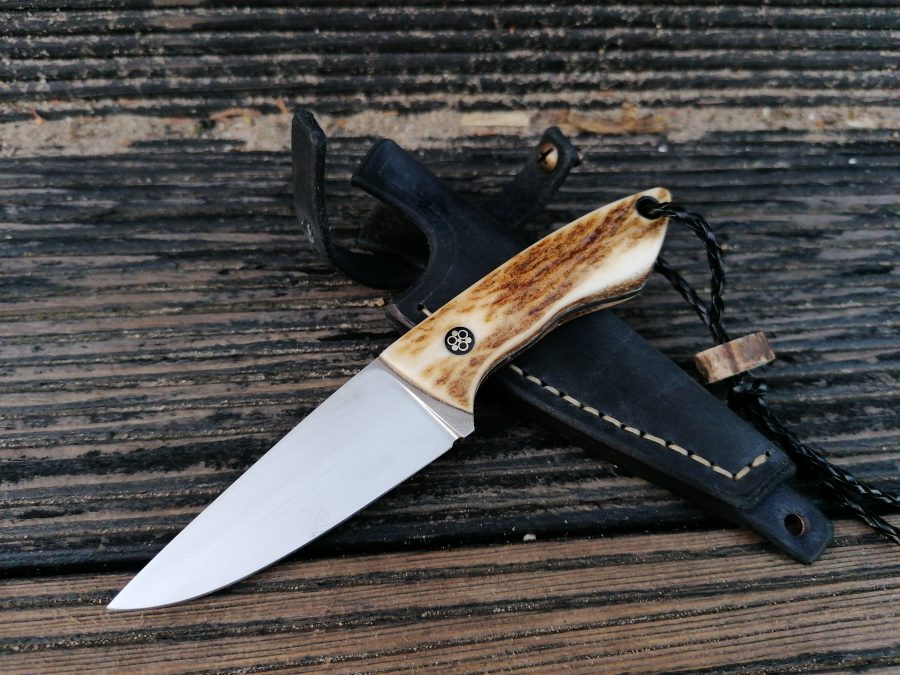 Rękojeść: poroże jelenia szlachetnego, pin mozaikowy- włokno węglowe,przelotka weglowa.Pochewka skóra.