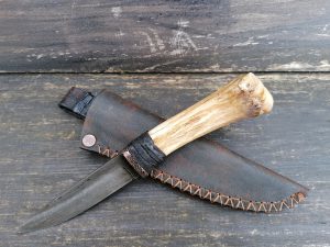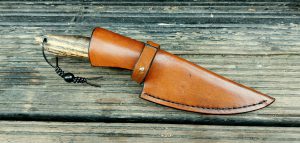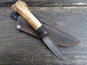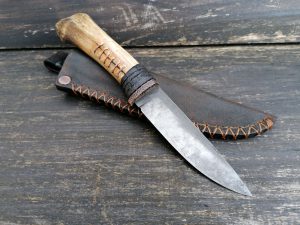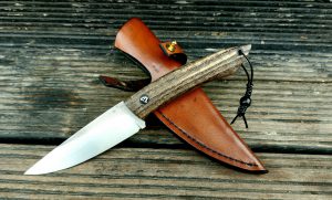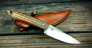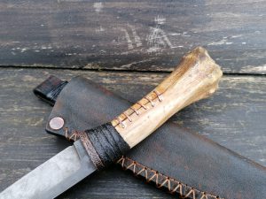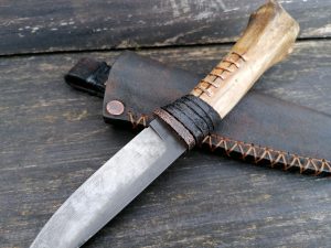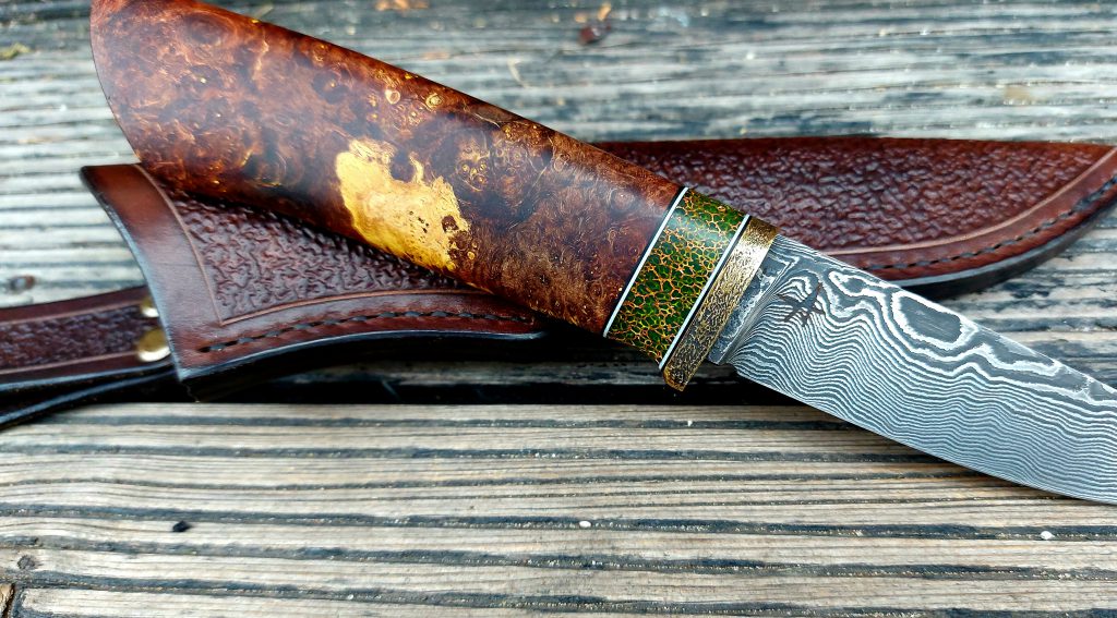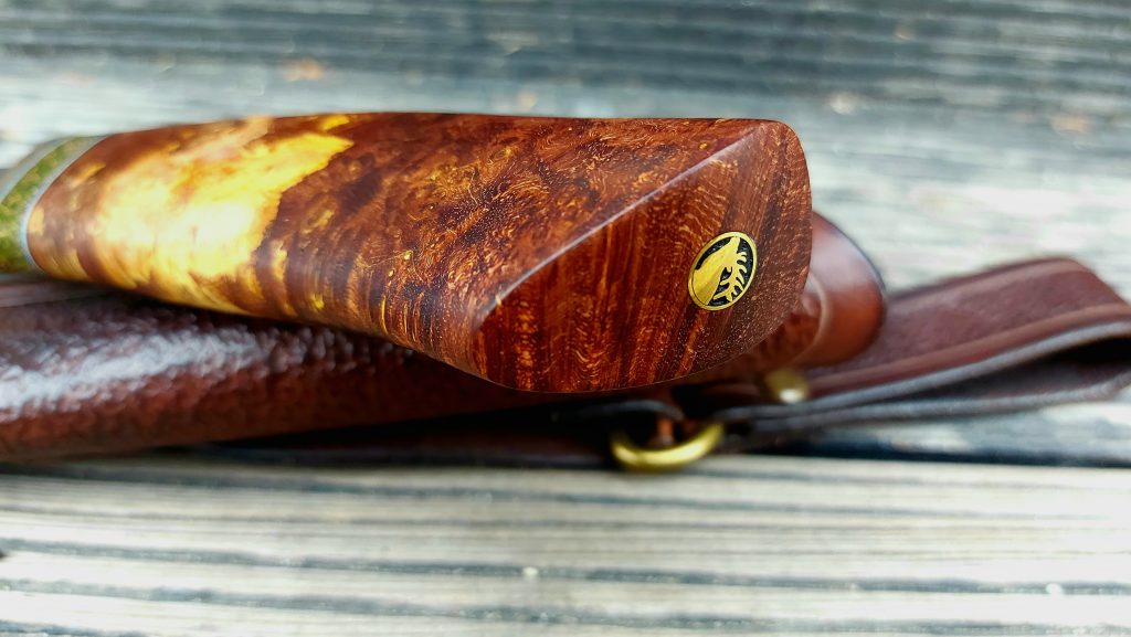 Rękojeść: mosiądz, G-10, miedź, drewno stabilizowane, pin jeleń. Pochewka skóra.