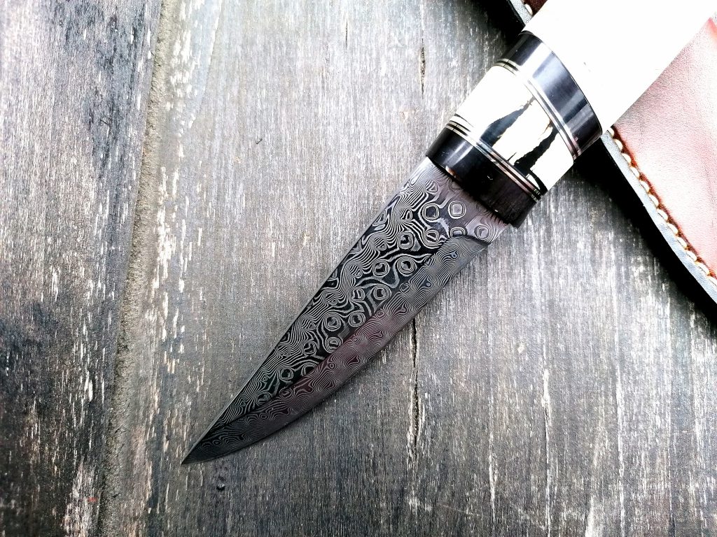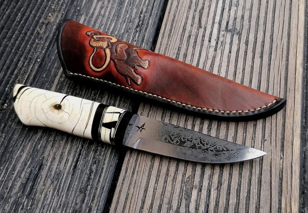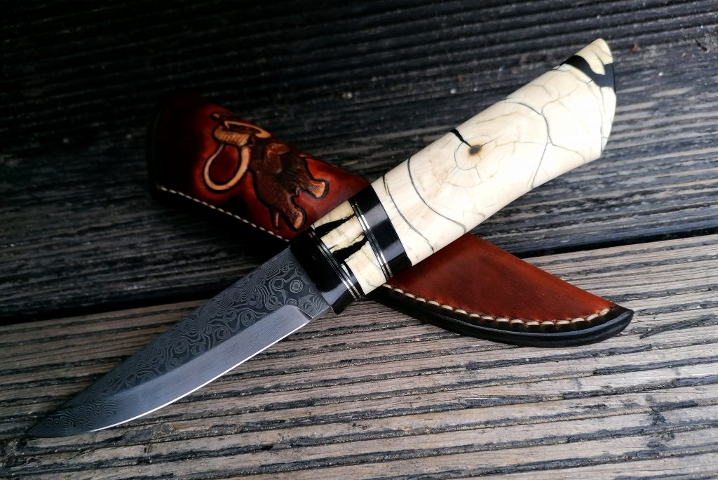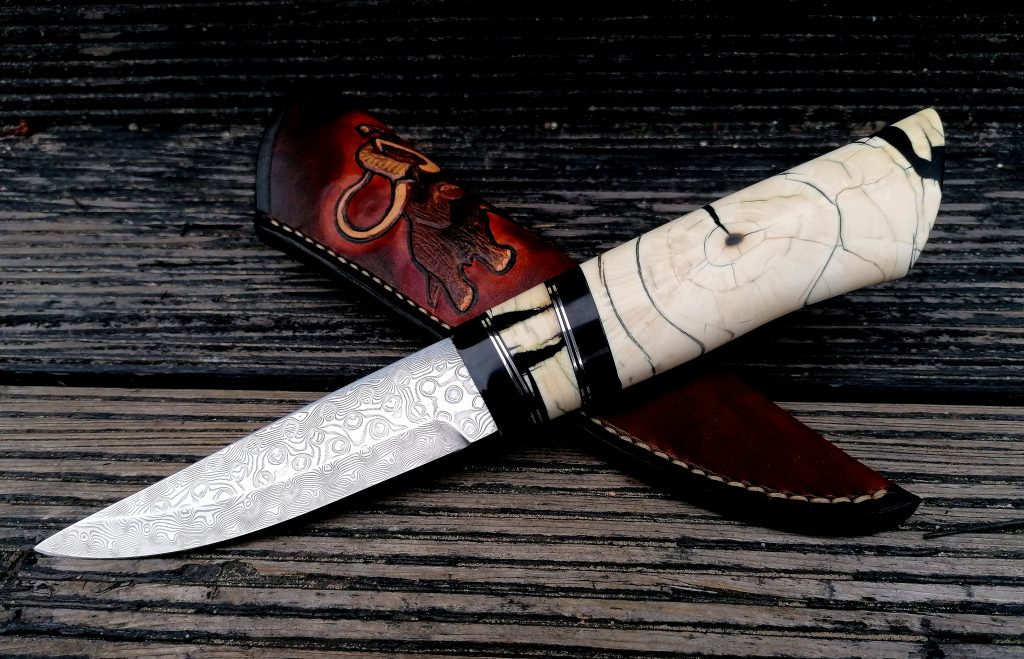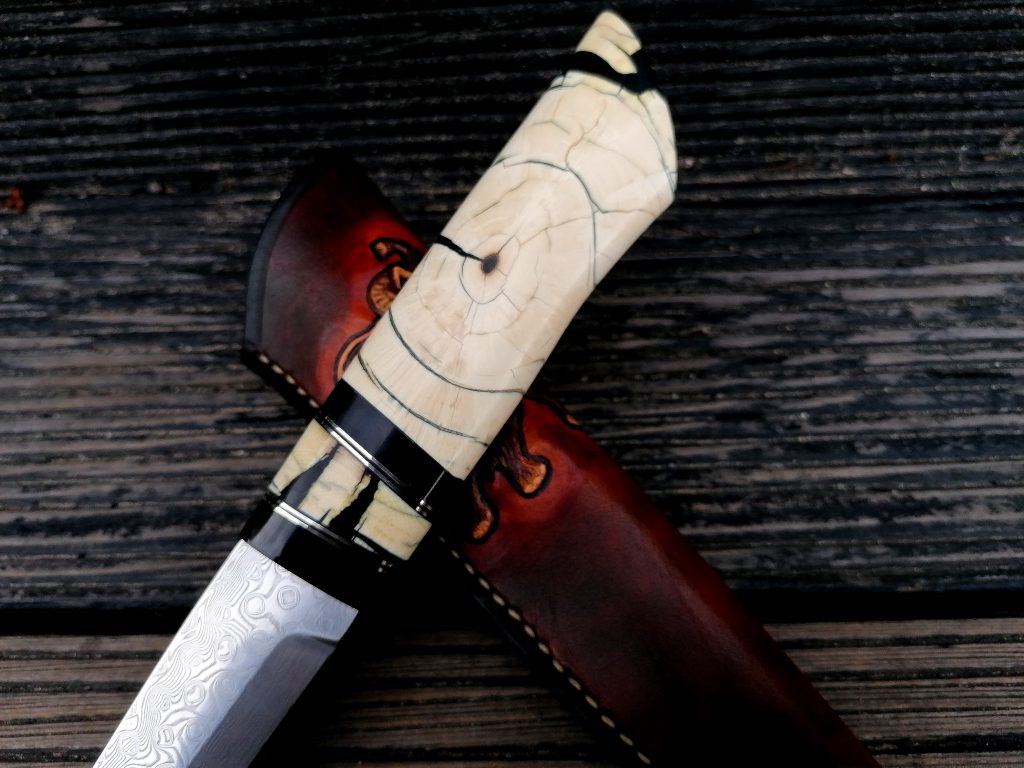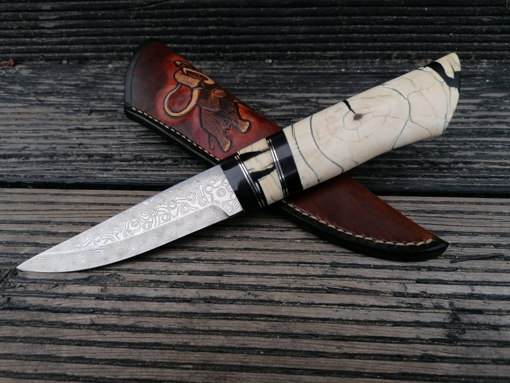 Rękojeść: róg bawoła wodnego, nowe srebro, stabilizowany kieł mamuta. Pochewka skóra.