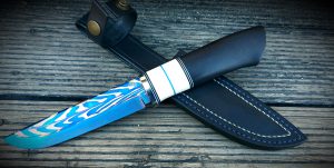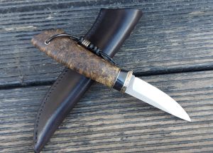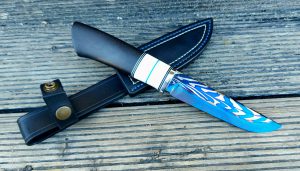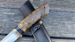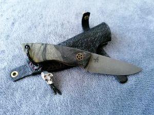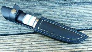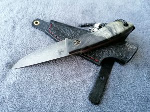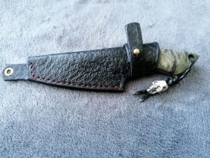Rękojeść: mosiądz, G-10, juma ivory, drewno stabilizowane, pin obrazkowy- jeleń. Pochewka skóra.